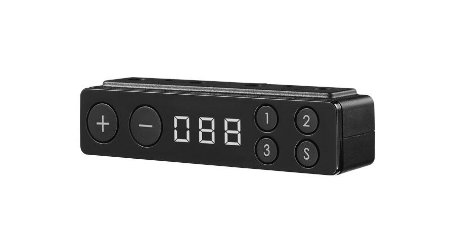 Elektrisch höhenverstellbare Monitor Halterungen, ausgestattet mit einer Kollisionsschutz-Einheit, werden mit einem serienmäßigen Handschalter geliefert. Dieses Bedienteil mit Memory-Funktion ersetzt den serienmäßigen Handschalter und ermöglicht die Speicherung von 3 Positionen, welche auf Knopfdruck abrufbar sind.